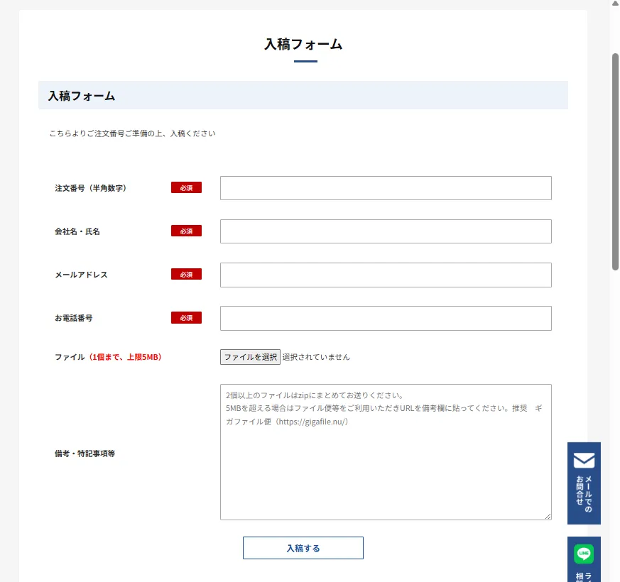 入稿フォームのURLは、ご注文完了後に届く「注文確認メール」に記載されています。