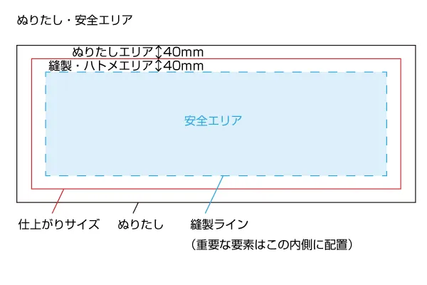 ◎仕上がりラインの内側40mmの縫製・ハトメエリアは、縫製やハトメと重なるので重要な文字や絵柄がかからないようにしましょう!