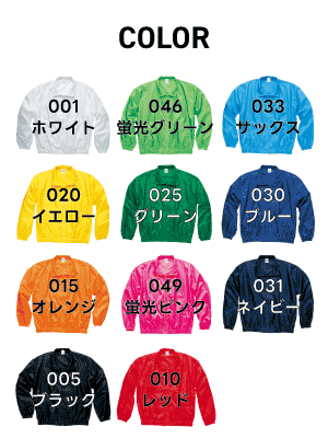 全11色展開となります。 001ホワイト/005ブラック/010レッド/015オレンジ/020イエロー/025グリーン/030ブルー/031ネイビー/033サックス/046蛍光グリーン/049蛍光ピンク